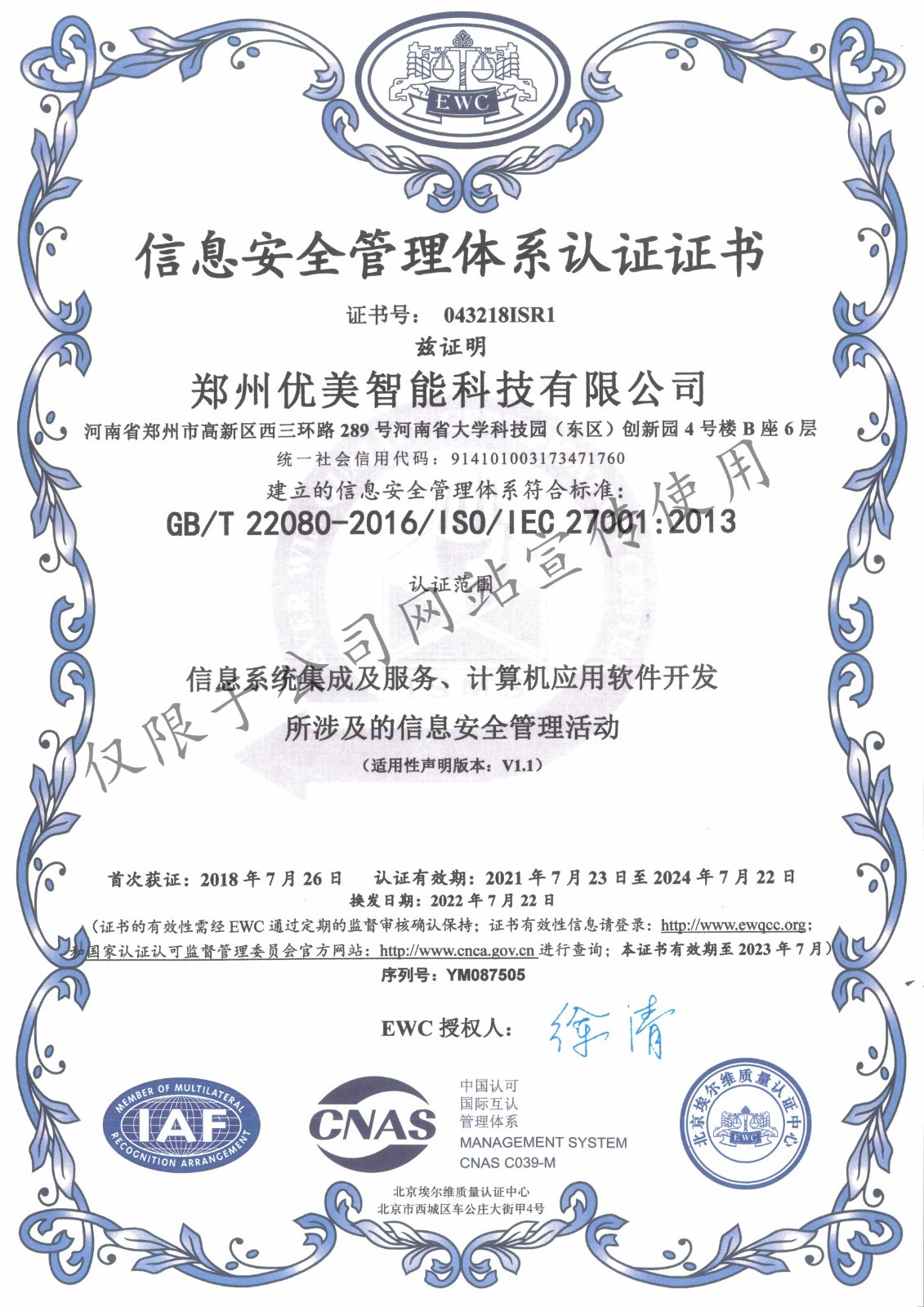 ISO27001信息清静治理系统认证证书