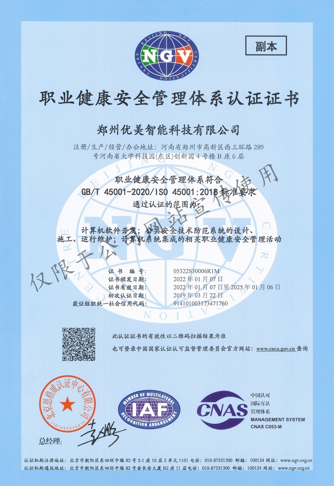 职业康健清静治理系统认证证书